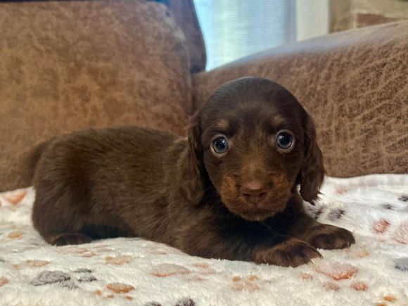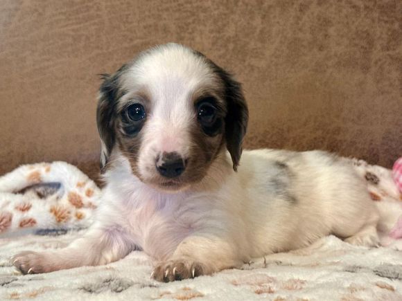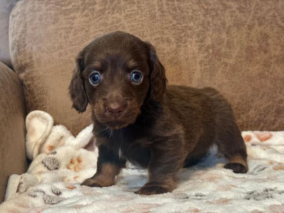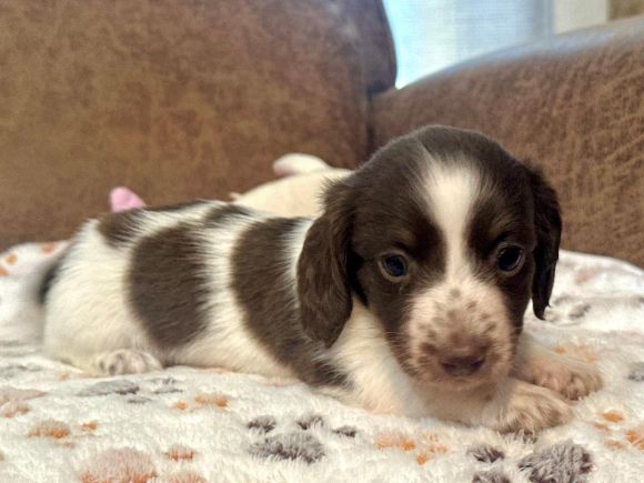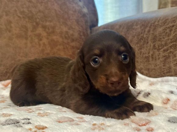 Pictures coming soon They call me "Chance" I'm a short hair chocolate and tan piebald with dapple markings male. I'm AKC Registered and was born on 6-16-2025. My parents are Liberty and Lucifer. I'm $2,200 with Limited Registration. With Limited Registration means that the dog is registered but No Litters produced by that dog are eligible for registration. I turned eight weeks old on 8-11-2025. For more information about me please call Debbie at (830)456-9640 or Email Debbie at debbiesdachshunds@yahoo.com