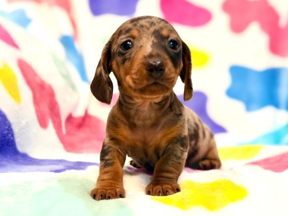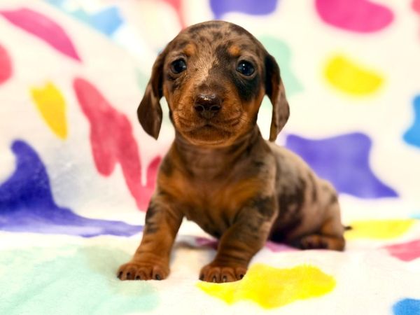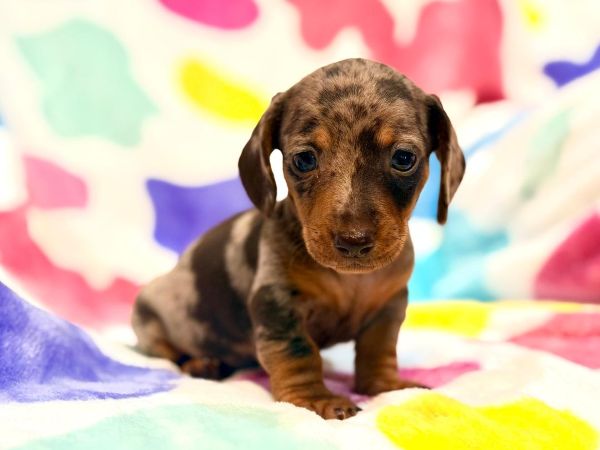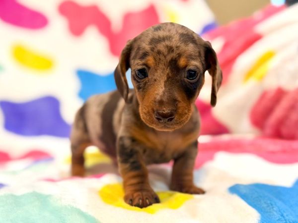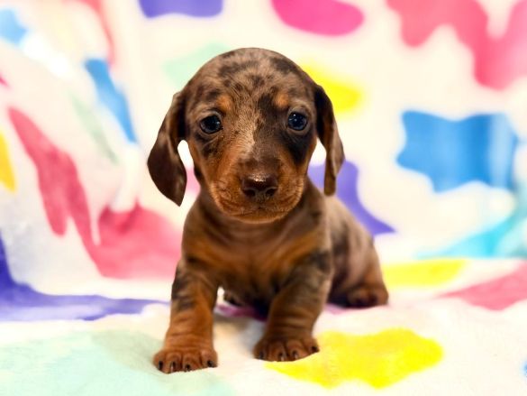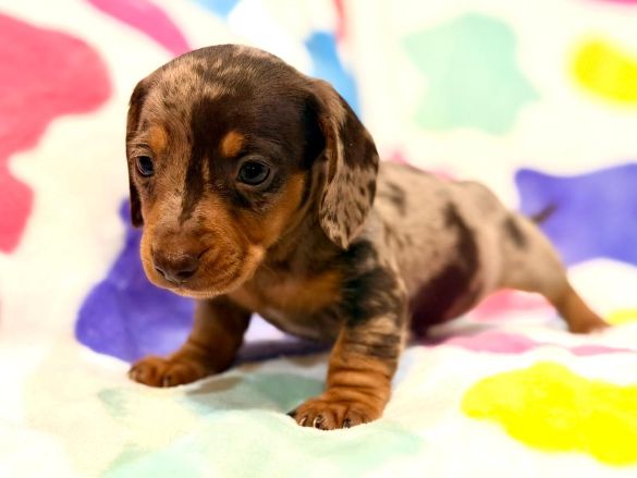 They call me "Rocky" I'm a short hair chocolate and tan dapple male. I'm AKC registered and was born on 3-8-2026. My parents are Snickers and Dexter. I'm $2,000 wtih Limited AKC Registration. Limited Registration means that the dog is registered but No Litters produced by that dog are eligible for registration. I will turn eight weeks old on 5-3-2026. For more information about me please call Denise at (830)992-5057 or Email Denise at deniseschladoer@aol.com