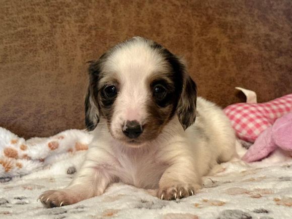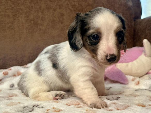 Sale Pending Sale Pending Sale Pending They call me "Skittles" I'm a long hair black and tan piebald with dapple markings female. I'm AKC Registered and was born on 9-8-2025. My parents are Ali and Dexter. I'm $2,400 with Limited Registration. With Limited Registration means that the dog is registered but No Litters produced by that dog are eligible for registration. I will turn eight weeks old on 11-3-2025. For more information about me please call Denise at (830)992-5057 or Email Denise at densieschladoer@aol.com