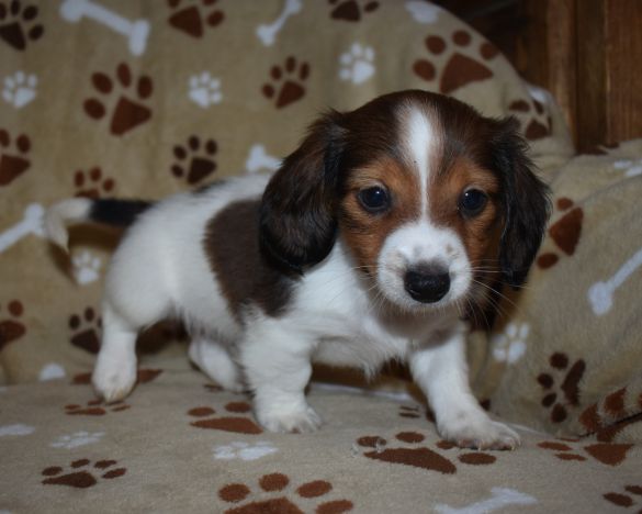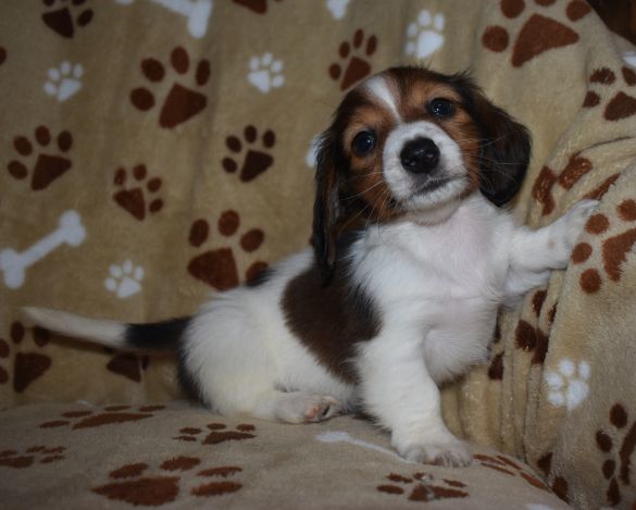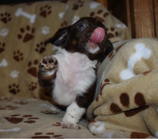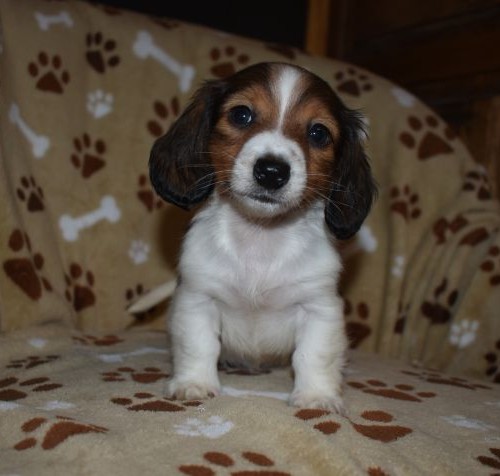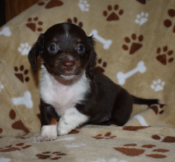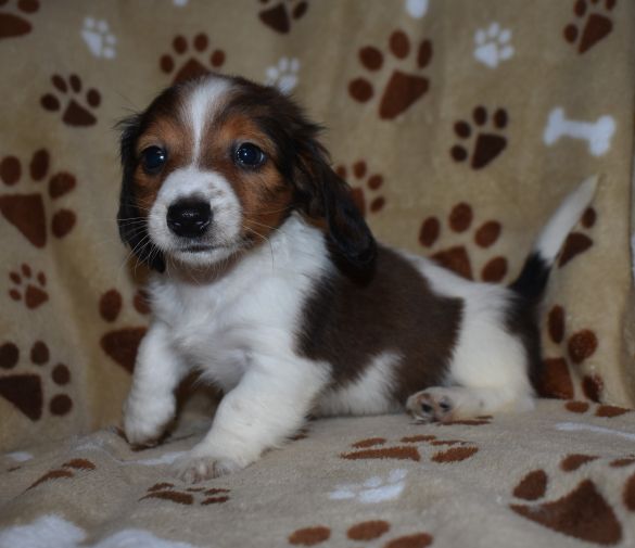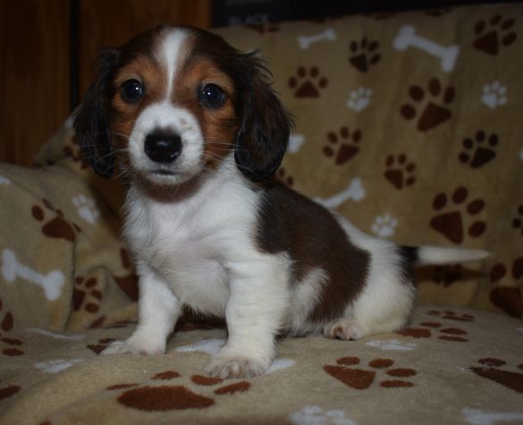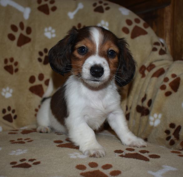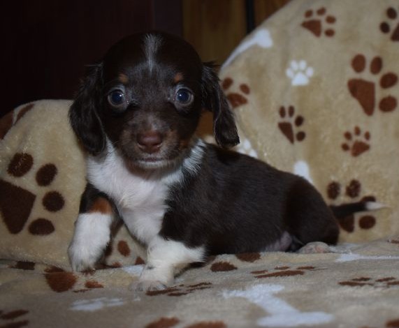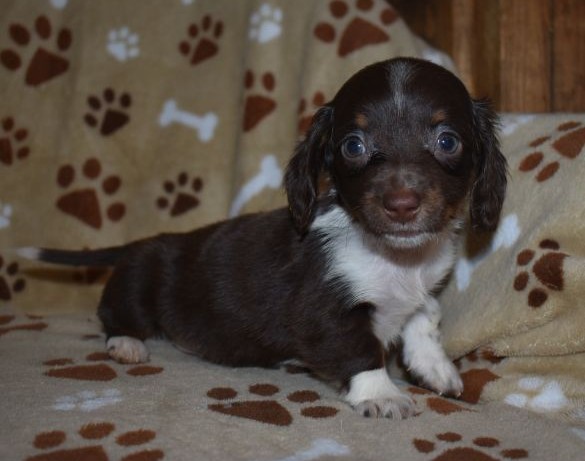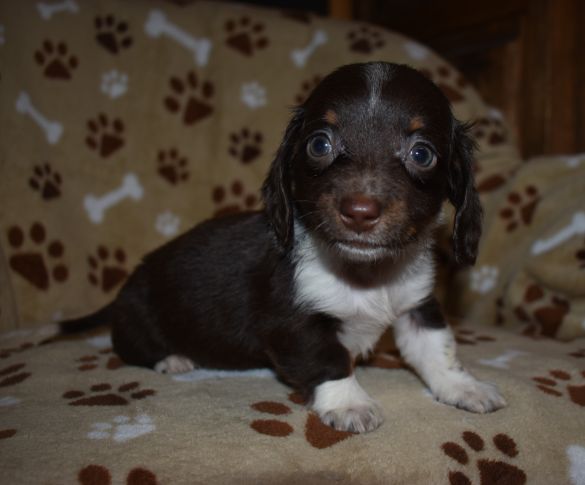 They call me "Candy" I'm a long hair chocolate and tan piebald female. I'm AKC registered and was born on 2-28-2026. My parents are Mallory and Chaos. I'm $2,000 wtih Limited AKC Registration. Limited Registration means that the dog is registered but No Litters produced by that dog are eligible for registration. I will turn eight weeks old on 4-25-2026. For more information about me please call Debbie at (830)456-9640 or Email Debbie at debbiesdachshunds@yahoo.com
