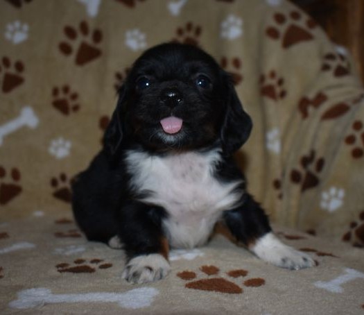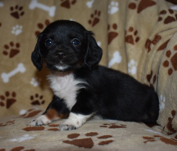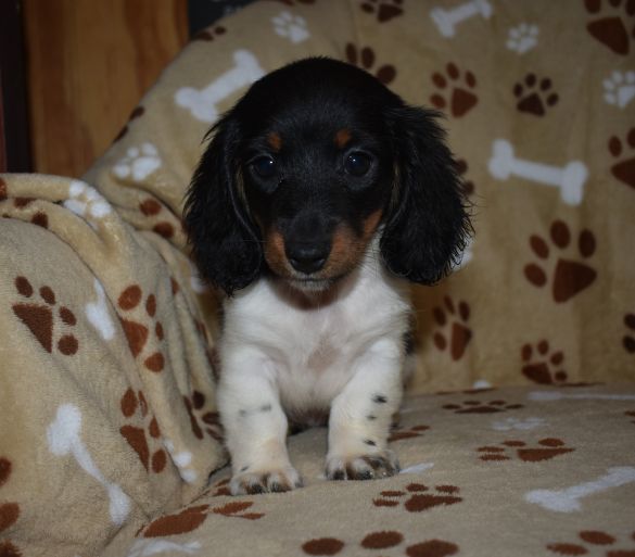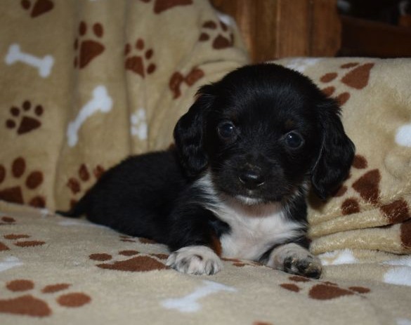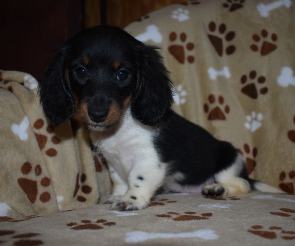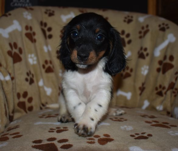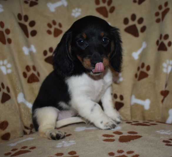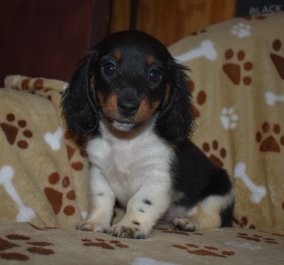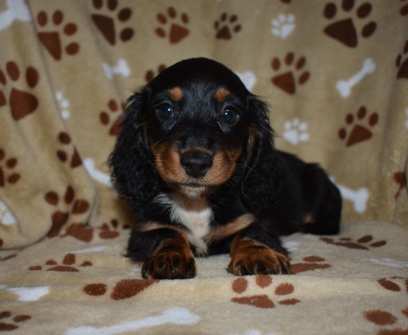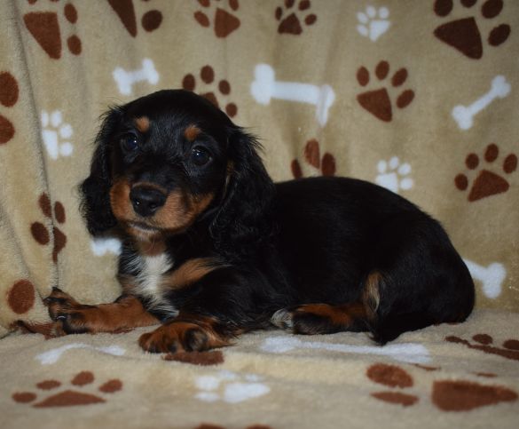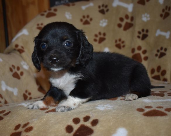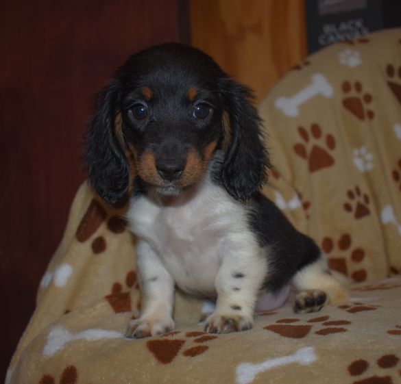 They call me "Skittles" I'm a long hair black and tan dapple female. I'm AKC registered and was born on 2-27-2026. My parents are Mabel and Dexter. I'm $2,200 wtih Limited AKC Registration. Limited Registration means that the dog is registered but No Litters produced by that dog are eligible for registration. I will turn eight weeks old on 4-24-2026. For more information about me please call Denise at (830)992-5057 or Email Denise at deniseschladoer@aol.com
