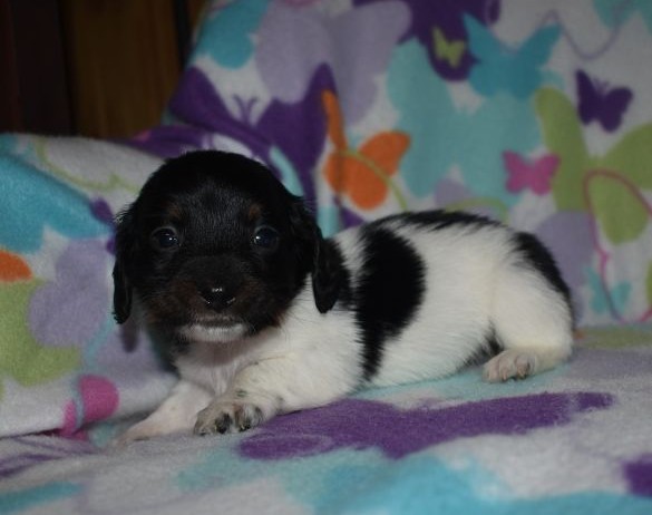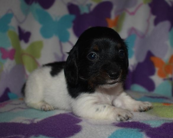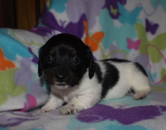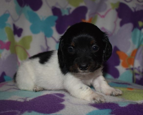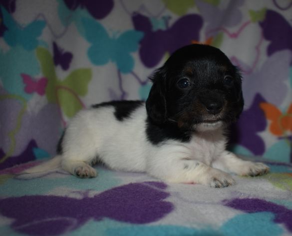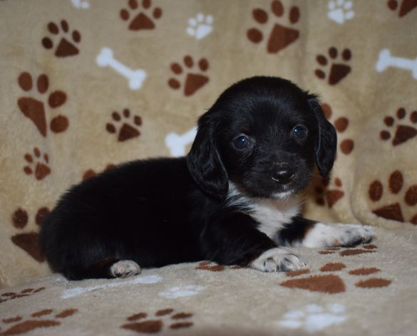 They call me "Oreo" I'm a long hair black and tan piebald female. I'm AKC registered and was born on 2-28-2026. My parents are Mallory and Chaos. I'm $2,000 wtih Limited AKC Registration. Limited Registration means that the dog is registered but No Litters produced by that dog are eligible for registration. I will turn eight weeks old on 4-25-2026. For more information about me please call Debbie at (830)456-9640 or Email Debbie at debbiesdachshunds@yahoo.com