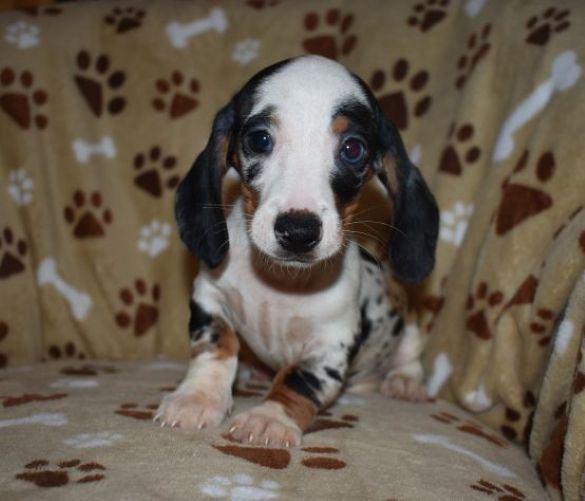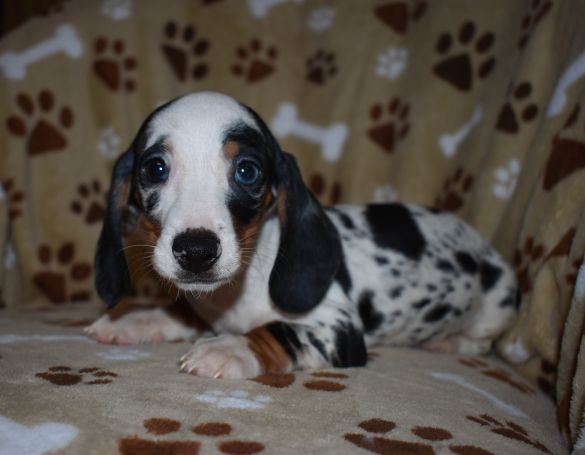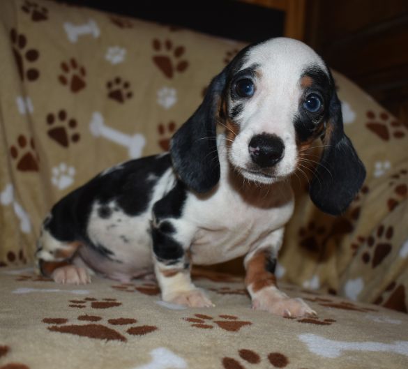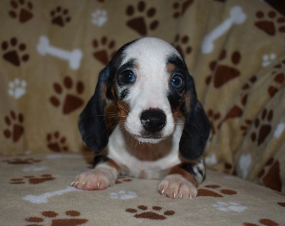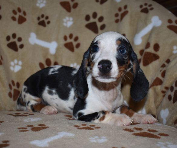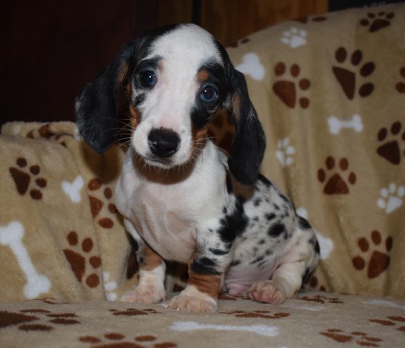 They call me "Jake" I'm a short hair black and tan piebald with dapple markings male. I'm AKC registered and was born on 2-9-2026. My parents are Sushi and Lick-A-Lot. I'm $2,200 wtih Limited AKC Registration. Limited Registration means that the dog is registered but No Litters produced by that dog are eligible for registration. I turned eight weeks old on 4-6-2026. For more information about me please call Debbie at (830)456-9640 or Email Debbie at debbiesdachshunds@yahoo.com