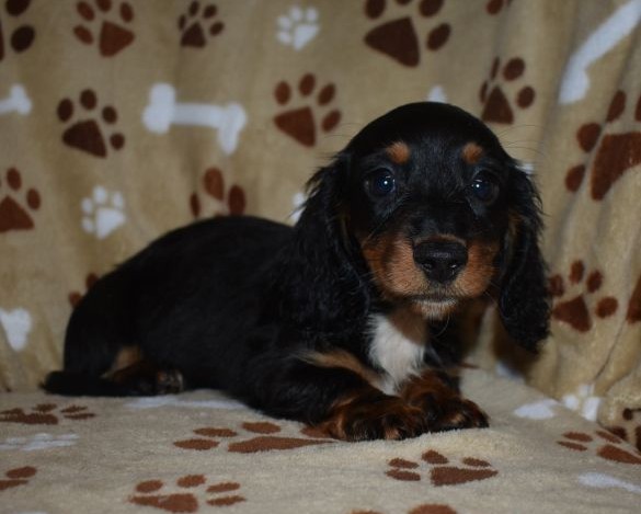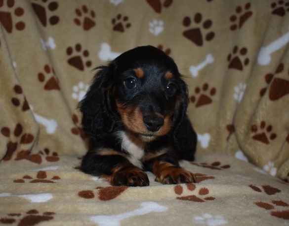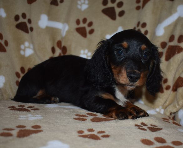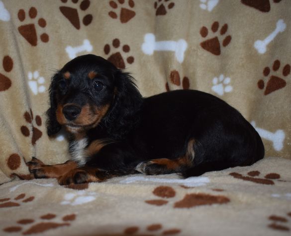 They call me "Cuddle Bug" I'm a long hair black and tan male. I'm AKC registered and was born on 2-9-2026. My parents are Sushi and Lick-A-Lot. I'm $1,600 wtih Limited AKC Registration. Limited Registration means that the dog is registered but No Litters produced by that dog are eligible for registration. I turned eight weeks old on 4-6-2026. For more information about me please call Debbie at (830)456-9640 or Email Debbie at debbiesdachshunds@yahoo.com