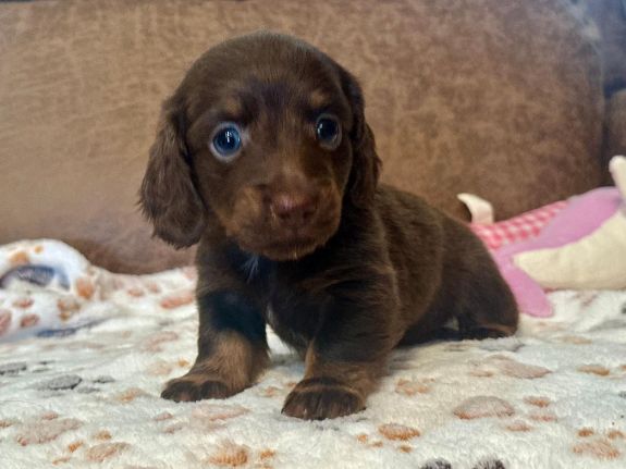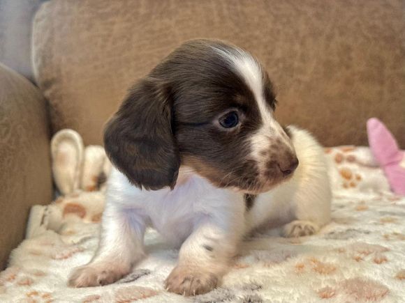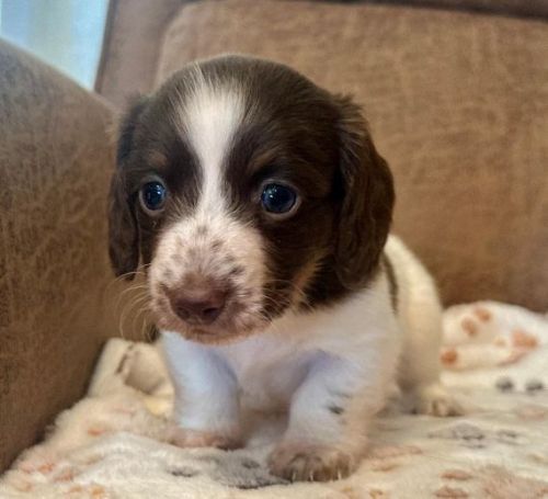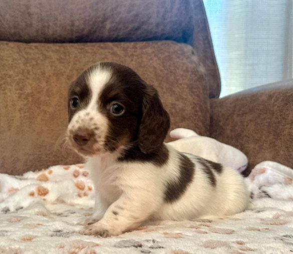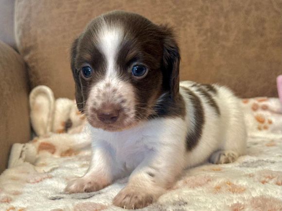 Pictures coming soon They call me "Chance" I'm a short hair chocolate and tan piebald with dapple markings male. I'm AKC Registered and was born on 6-16-2025. My parents are Liberty and Lucifer. I'm $2,200 with Limited Registration. With Limited Registration means that the dog is registered but No Litters produced by that dog are eligible for registration. I turned eight weeks old on 8-11-2025. For more information about me please call Debbie at (830)456-9640 or Email Debbie at debbiesdachshunds@yahoo.com