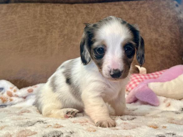Sale Pending Sale Pending Sale Pending They call me "Skittles" I'm a long hair black and tan piebald with dapple markings female. I'm AKC Registered and was born on 9-8-2025. My parents are Ali and Dexter. I'm $2,400 with Limited Registration. With Limited Registration means that the dog is registered but No Litters produced by that dog are eligible for registration. I will turn eight weeks old on 11-3-2025. For more information about me please call Denise at (830)992-5057 or Email Denise at densieschladoer@aol.com
