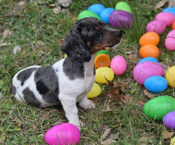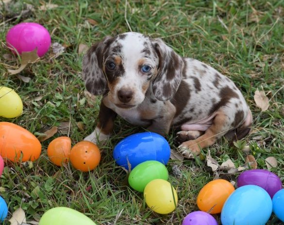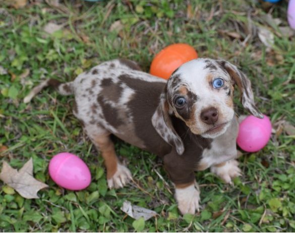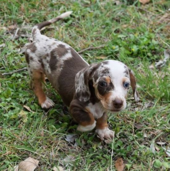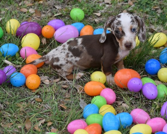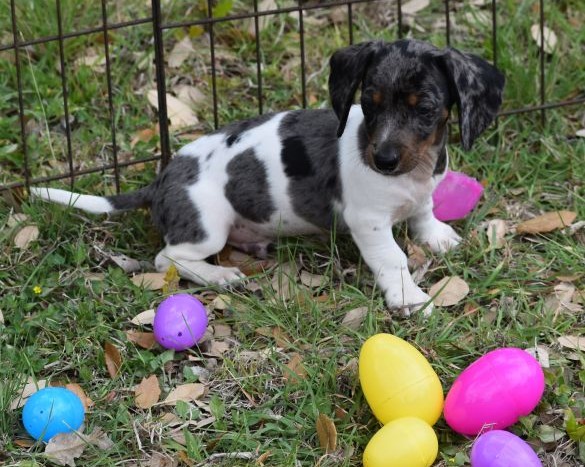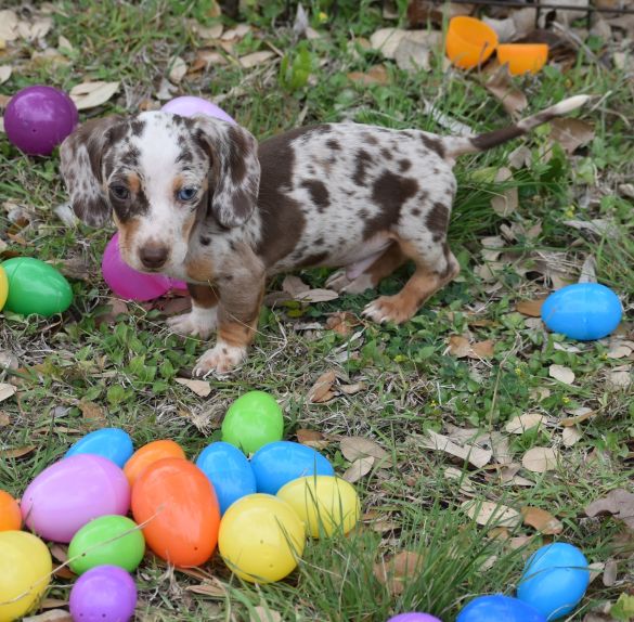 They call me "Cosmo" I'm a short hair chocolate and tan piebald with dapple markings male. I'm AKC registered and was born on 1-1-2026. My parents are Patience and Charlie Brown. I'm $2,200 wtih Limited AKC Registration. Limited Registration means that the dog is registered but No Litters produced by that dog are eligible for registration. I turned eight weeks old on 2-26-2026. For more information about me please call Debbie at (830)456-9640 or Email Debbie at debbiesdachshunds@yahoo.com