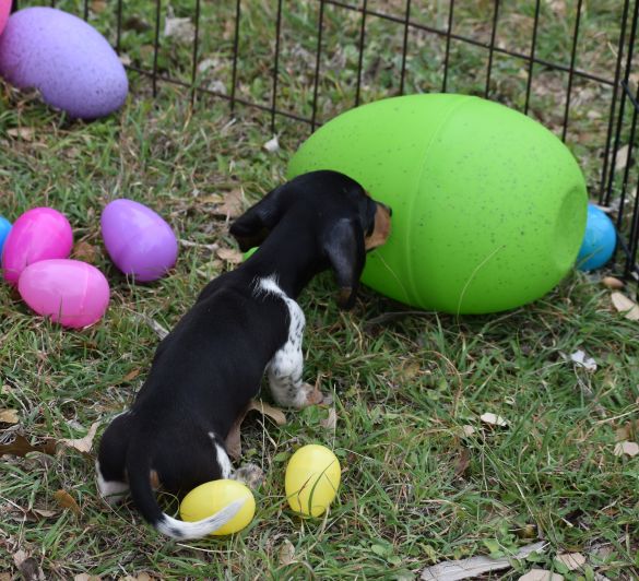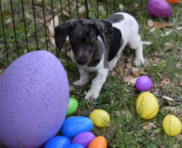 They call me "MoJo" I'm a short hair black and tan piebald with dapple markings male. I'm AKC registered and was born on 1-15-2026. My parents are Twizzler and Ranger. I'm $2,200 wtih Limited AKC Registration. Limited Registration means that the dog is registered but No Litters produced by that dog are eligible for registration. I turned eight weeks old on 3-12-2026. For more information about me please call Debbie at (830)456-9640 or Email Debbie at debbiesdachshunds@yahoo.com