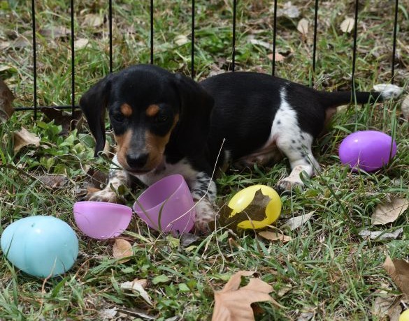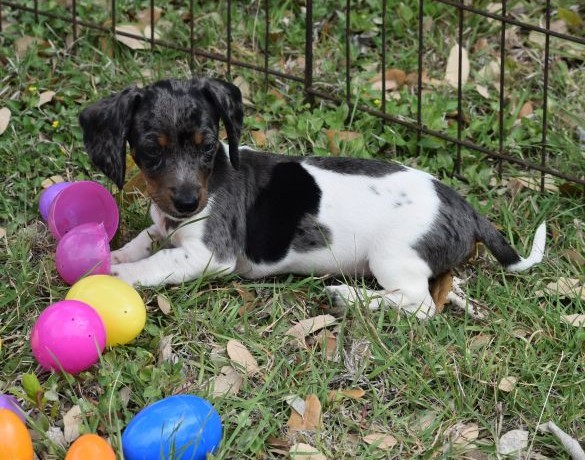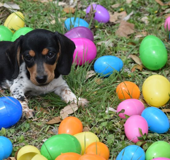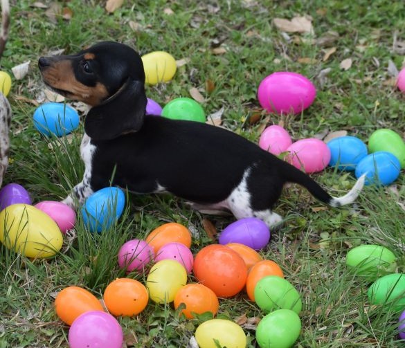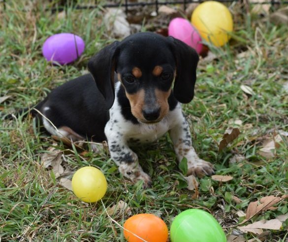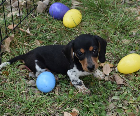 They call me " " I'm a short hair black and tan piebald with dapple markings male. I'm AKC registered and was born on 2-9-2026. My parents are Sushi and Lick-A-Lot. I'm $2,300 wtih Limited AKC Registration. Limited Registration means that the dog is registered but No Litters produced by that dog are eligible for registration. I will turn eight weeks old on 4-6-2026. For more information about me please call Debbie at (830)456-9640 or Email Debbie at debbiesdachshunds@yahoo.com